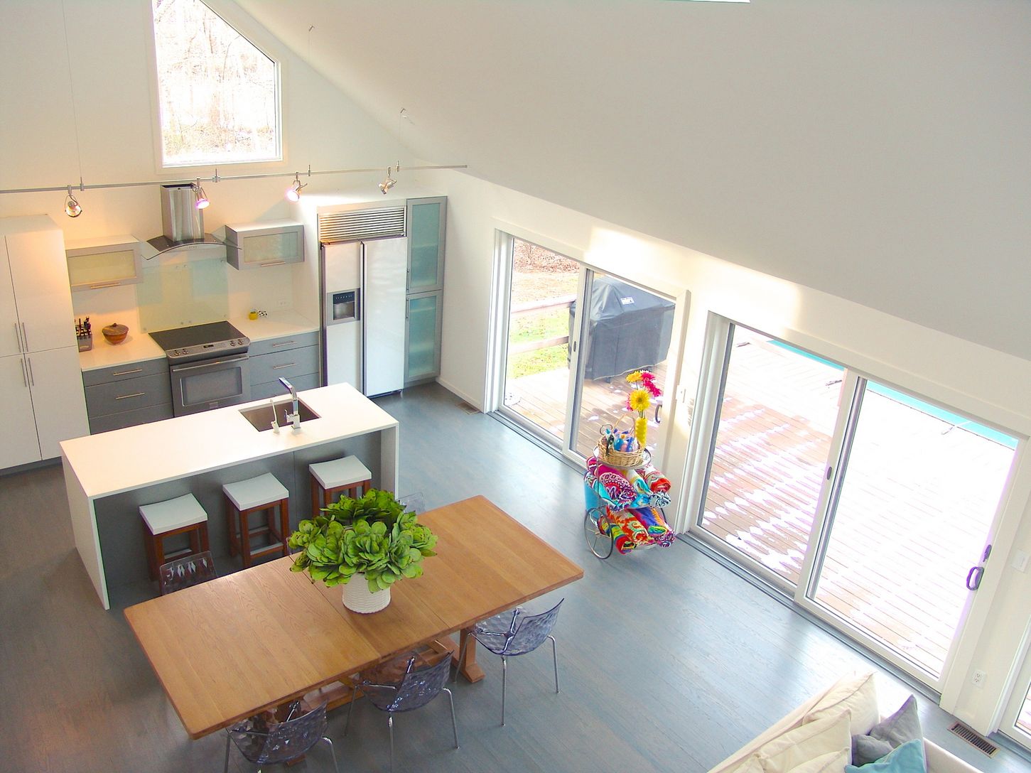 Step inside to this stunning and completely renovated contemporary. Crisp and impeccably designed with an open floor that is bright and light filled. A well thought out and simply gorgeous kitchen with high end apliances and beautiful detail open to a spacious living room with fireplace. Master bedroom suite on the first floor with sliders out to deck. Three large guest bedrooms, two additional and beautiful full bathrooms. Soaring ceilings wi