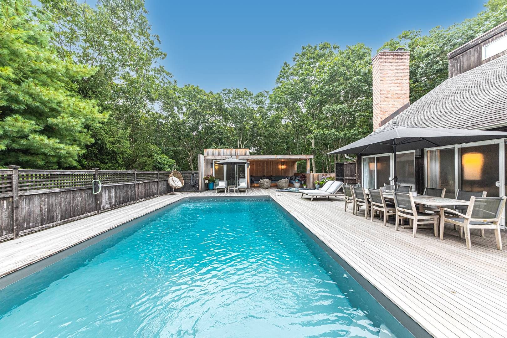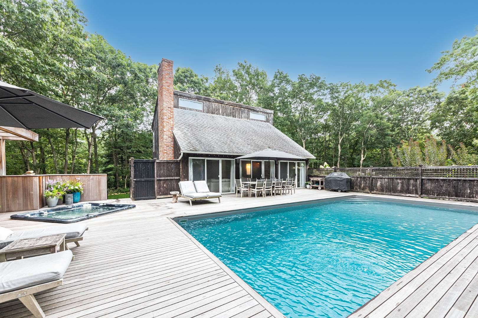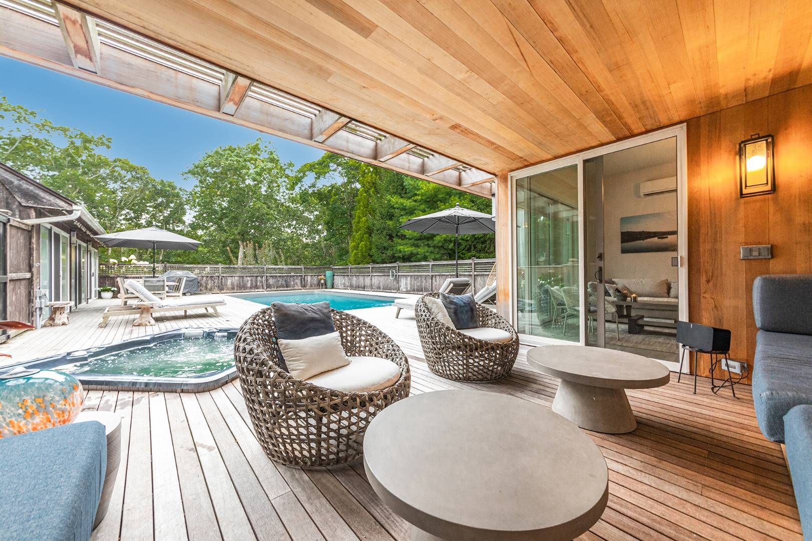 This ultra chic East Hampton retreat is the perfect summer or year-round getaway. Nestled amidst a private, lushly landscaped shy-acre, this newly-renovated home boasts a light-filled great room with fireplace and modern kitchen, 3 bedrooms/ 3.5 baths, and fabulous finished lower level with bonus space. You and your guests will enjoy al fresco dining and entertaining on the sun-drenched deck with heated pool, hot tub, and gorgeous new modern p