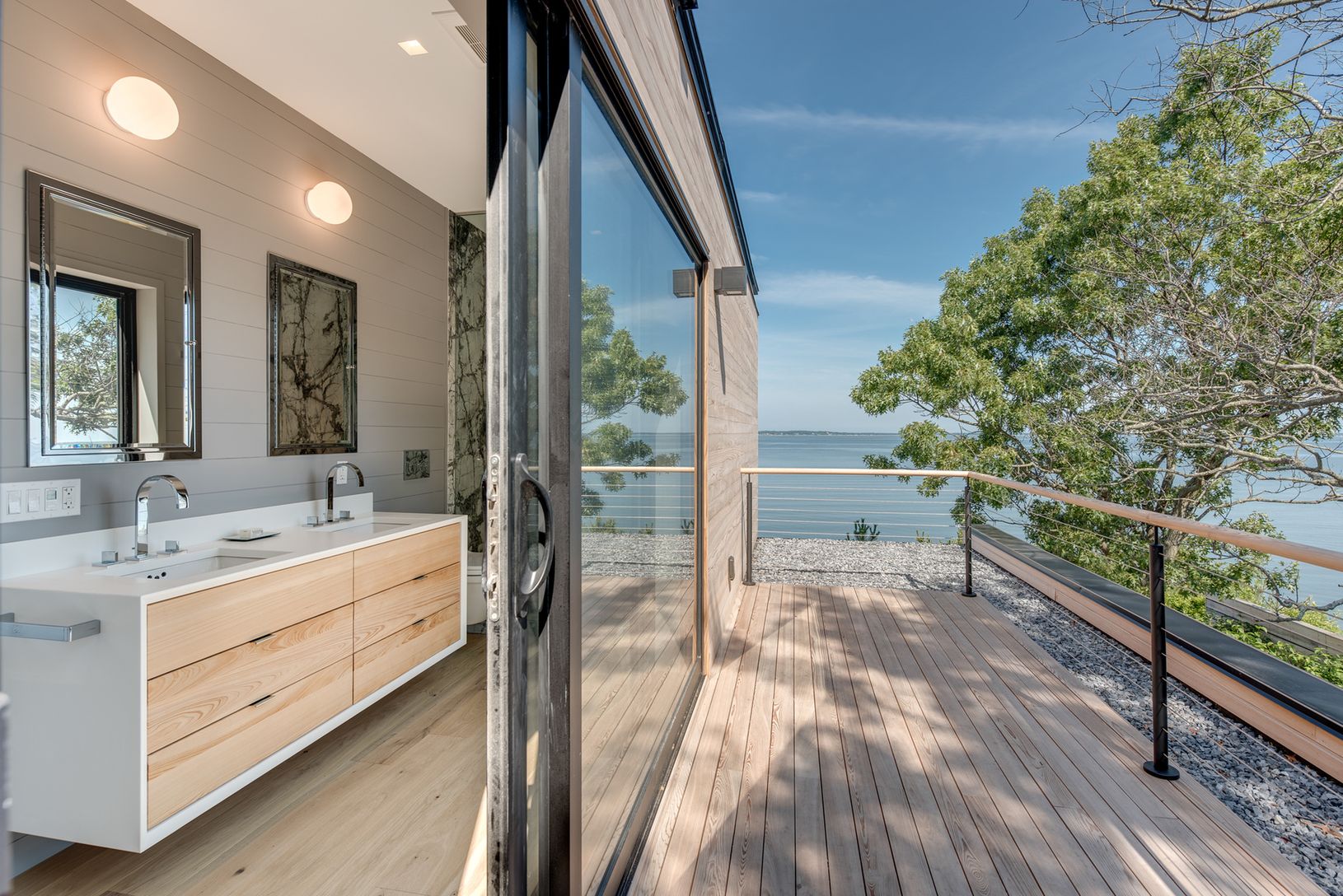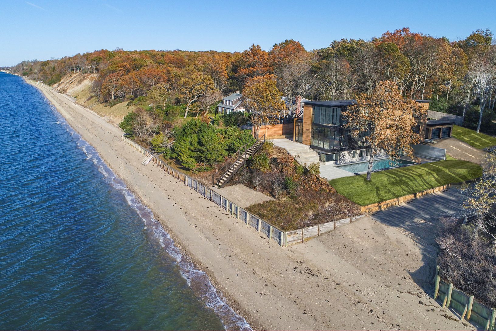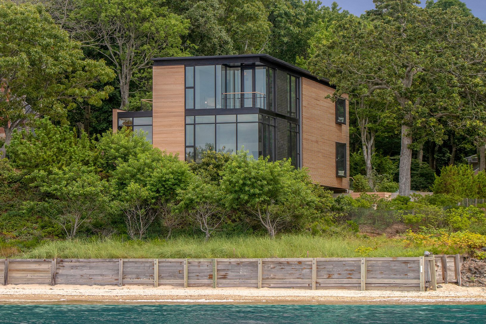 Walls of glass on two floors of this modern waterfront home showcase a panorama of sea and sky, with west views across Peconic Bay to Robins Island and the North Fork. Designed by Naiztat+Ham Architects, the home's 5,500+/- sq. ft. of living space on three floors offer six bedrooms, five full and two half baths, and the finest European amenities throughout. Open first floor living areas flow between the living room with wood-burning fireplace,