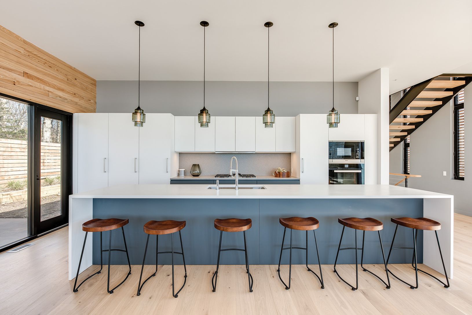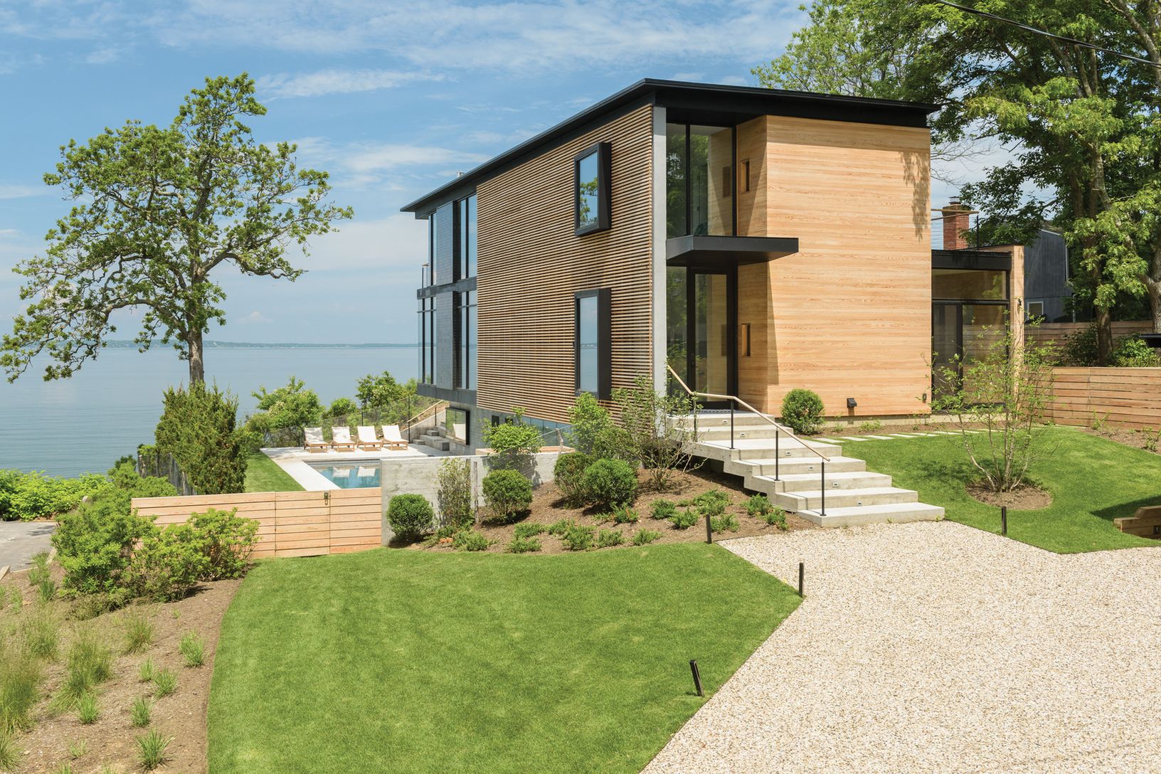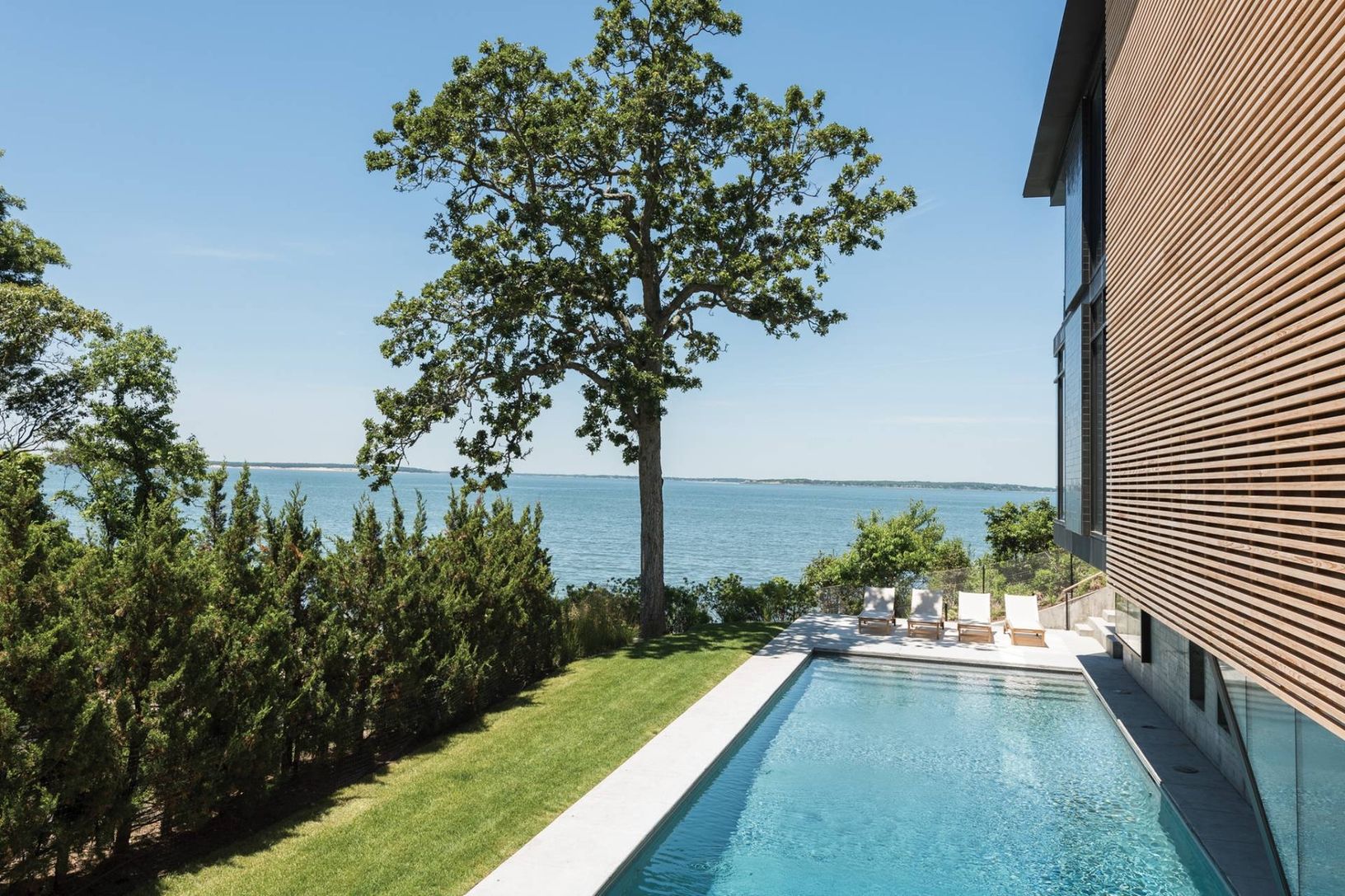 Walls of glass on two floors of this modern waterfront home showcase a panorama of sea and sky, with west views across Peconic Bay to Robins Island and the North Fork. Designed by Naiztat+Ham Architects, the home's 5,500+/- sq. ft. of living space on three floors offer six bedrooms, five full and two half baths, and the finest European amenities throughout. Open first floor living areas flow between the living room with wood-burning fireplace,