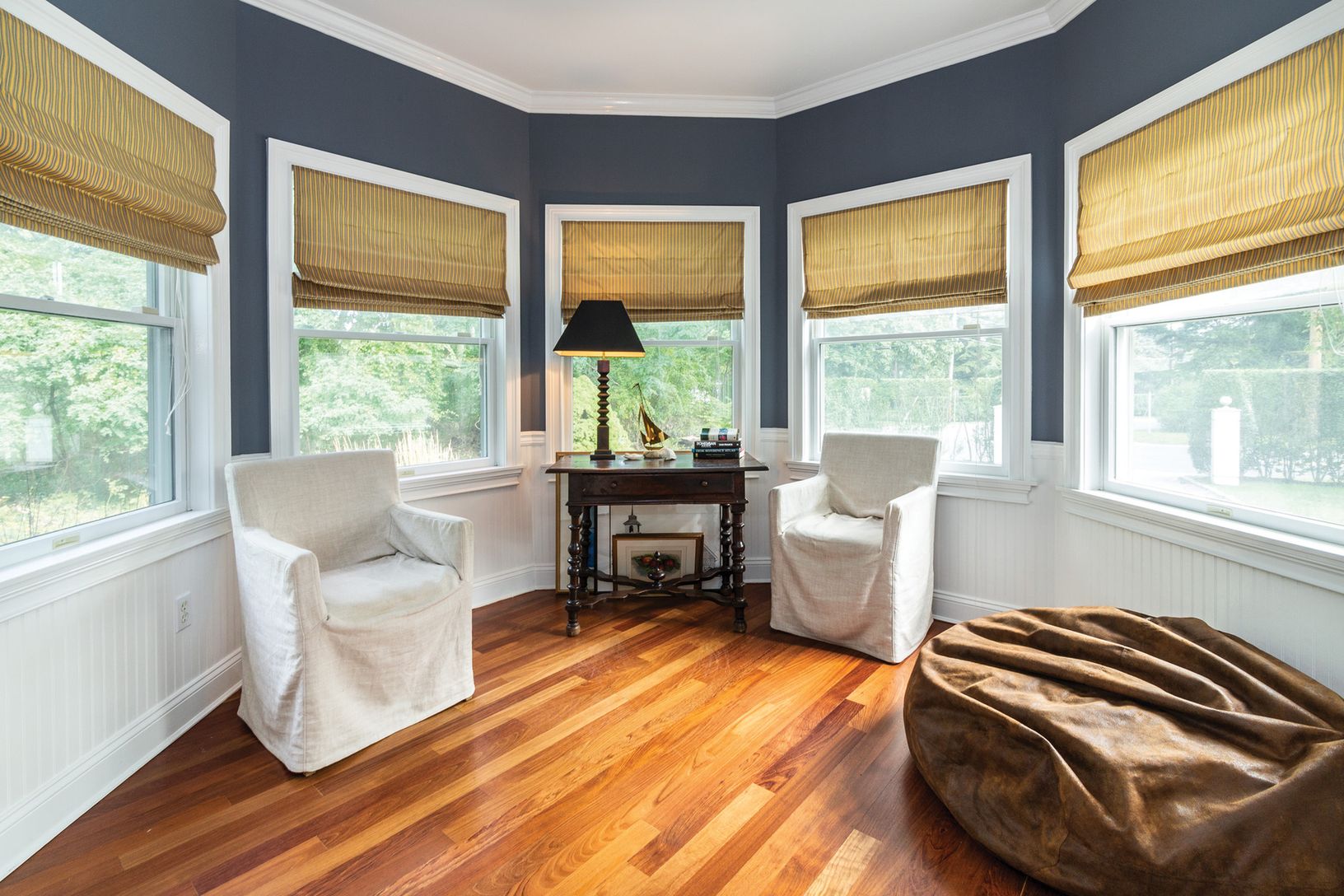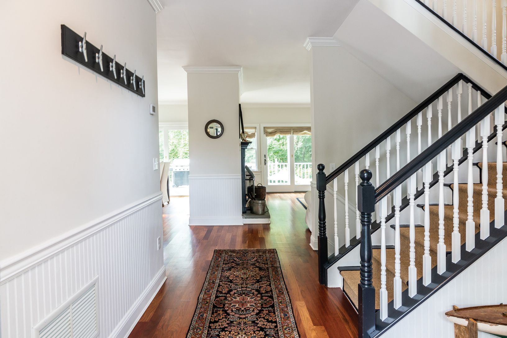 Located just outside Shelter Island Heights, within close proximity to ferry, fine dining, tennis and marina, this colonial, built in 1998 and renovated in 2015, is stylish and turnkey. The first floor has an entry foyer with adjacent library and powder room, opening to a layout comprised of living-dining and kitchen, adroitly separated by a handsome fireplace, with doors to a second floor rear deck with seasonal views to Dering Harbor and Cha