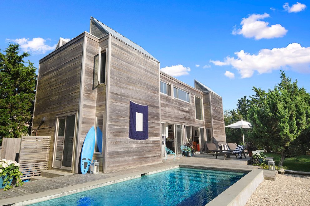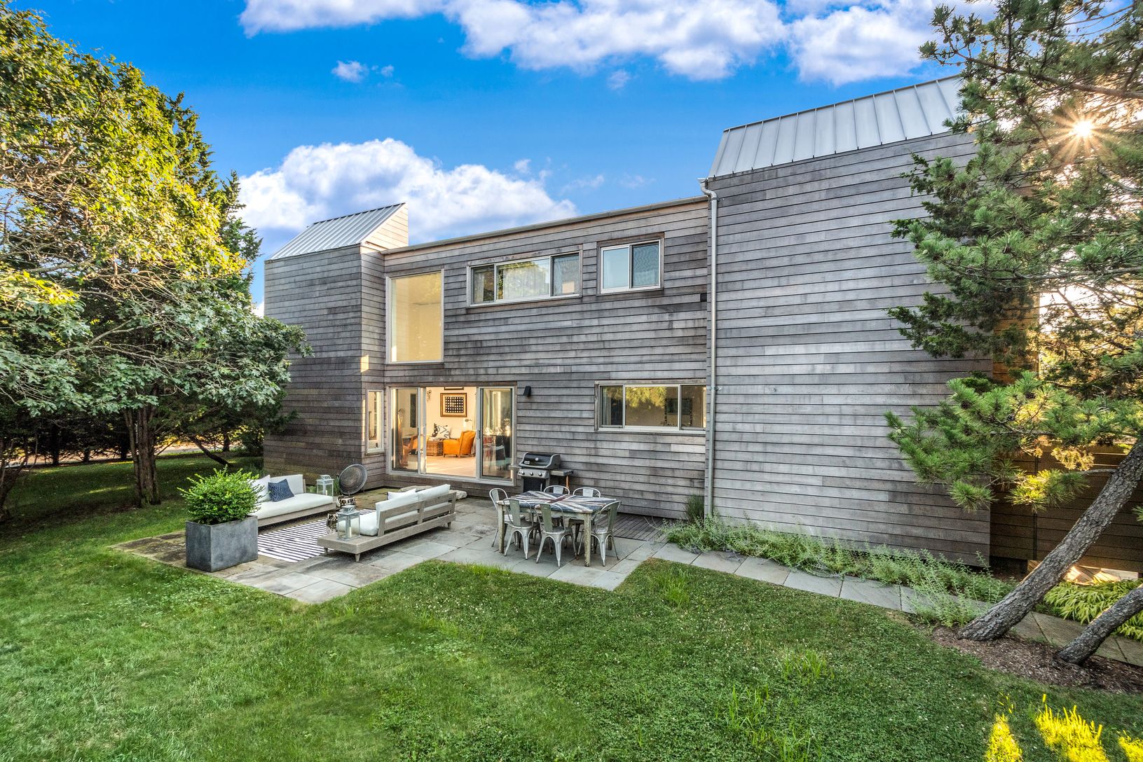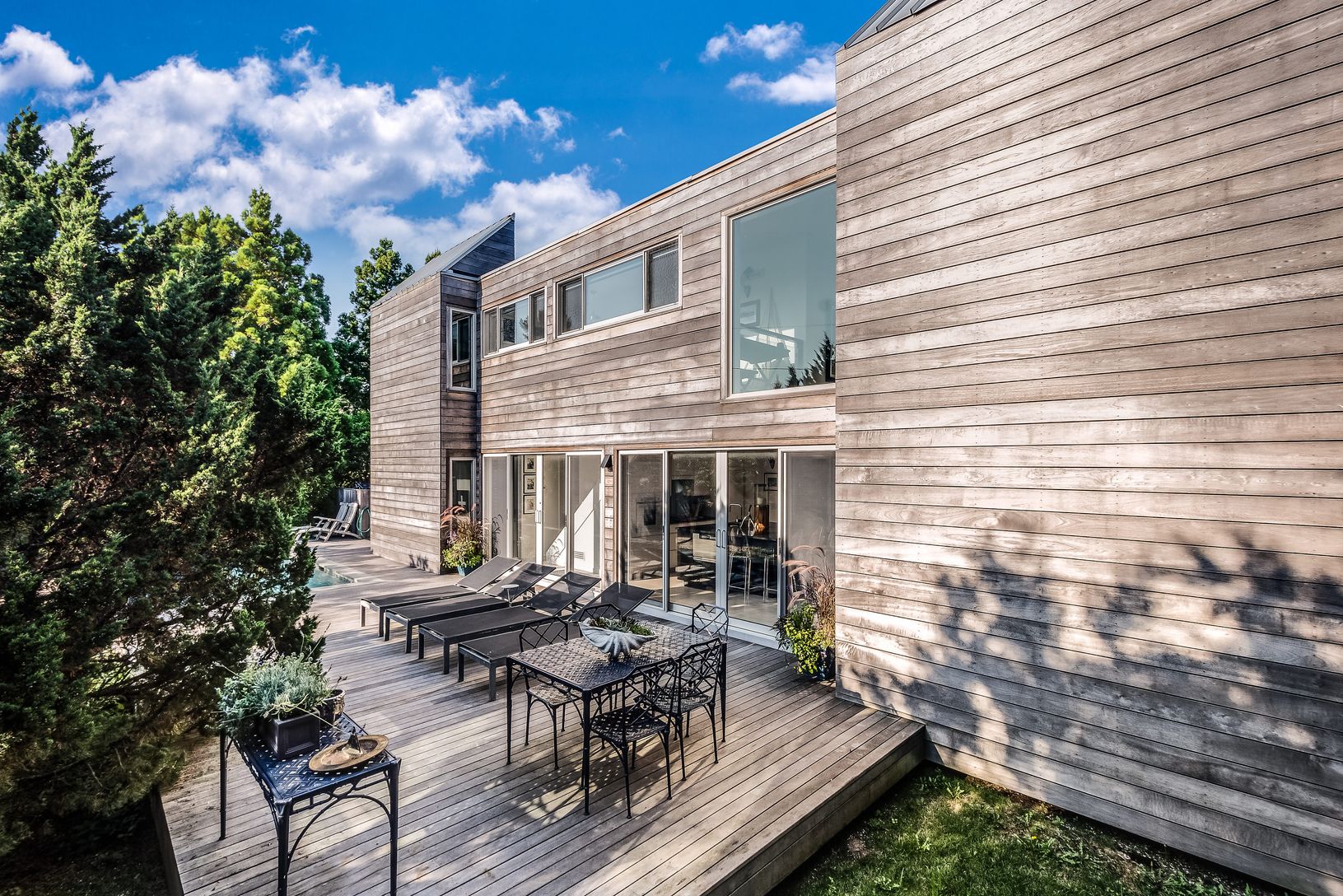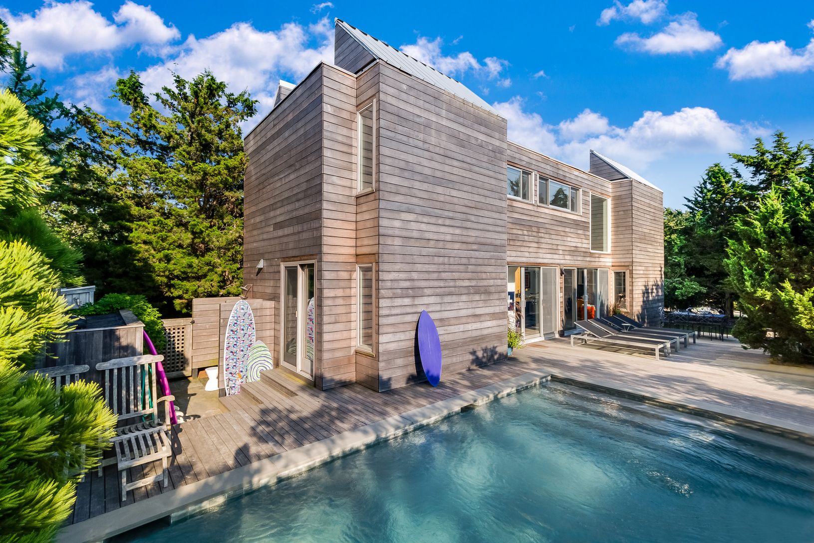 Recently renovated and price improved modern beach house (new siding and new decks ~ new photos coming) with heated gunite pool set in a very private corner lot with its open grassy lawn just a short distance to the ocean beach. Merging the outside and inside with walls of glass embracing the private yards with several patios and deck for alfresco entertaining. There are four bedrooms, two unique modern bathrooms, a large inviting outdoor show