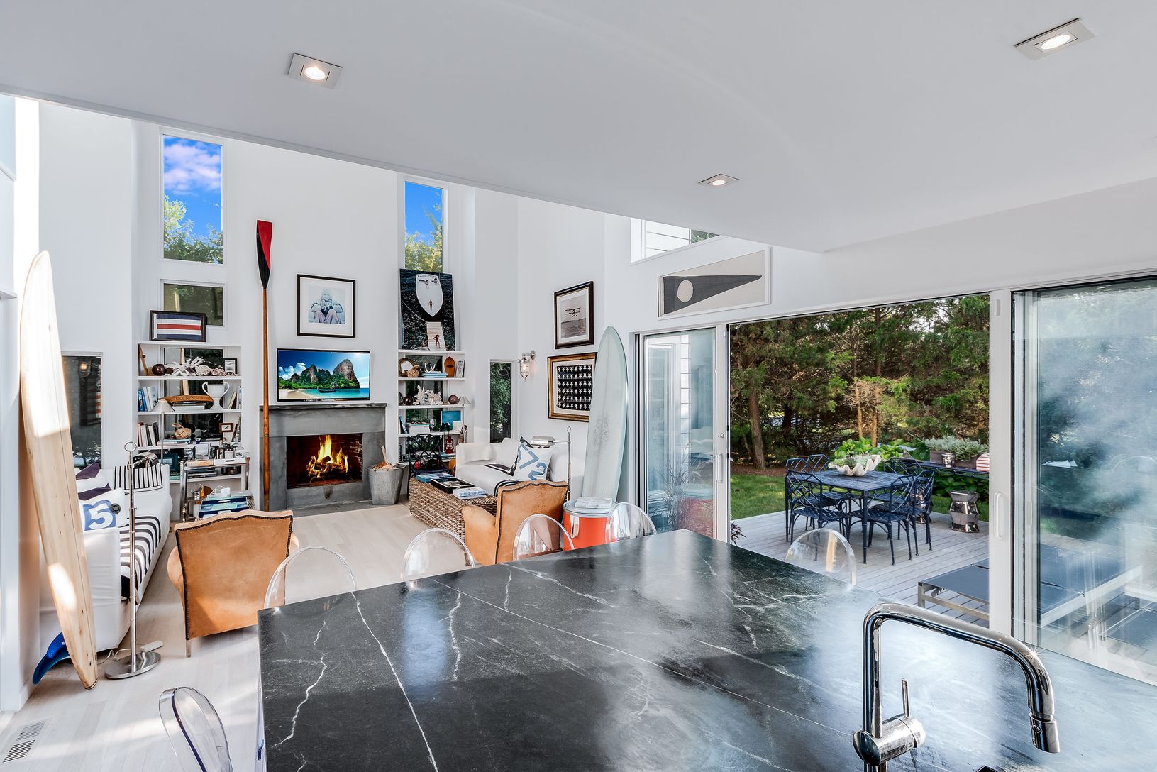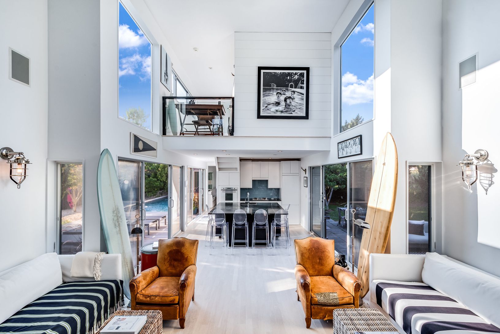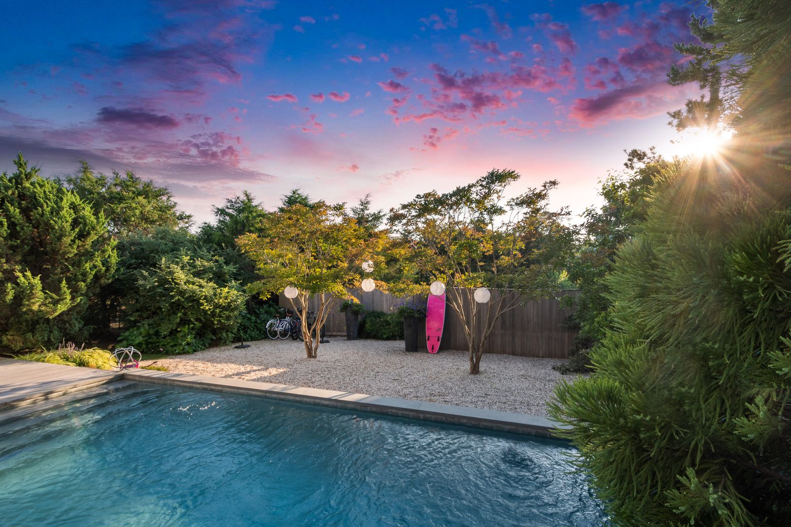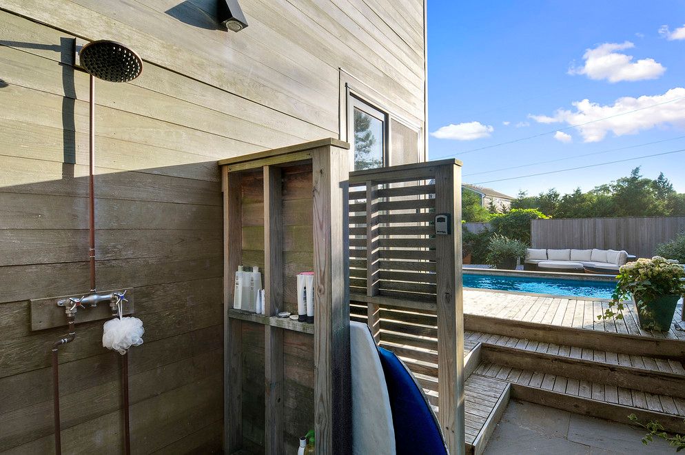 Recently renovated and price improved modern beach house (new siding and new decks ~ new photos coming) with heated gunite pool set in a very private corner lot with its open grassy lawn just a short distance to the ocean beach. Merging the outside and inside with walls of glass embracing the private yards with several patios and deck for alfresco entertaining. There are four bedrooms, two unique modern bathrooms, a large inviting outdoor show