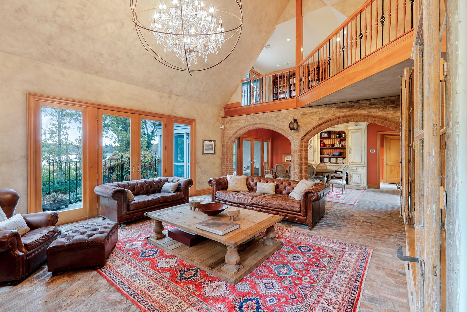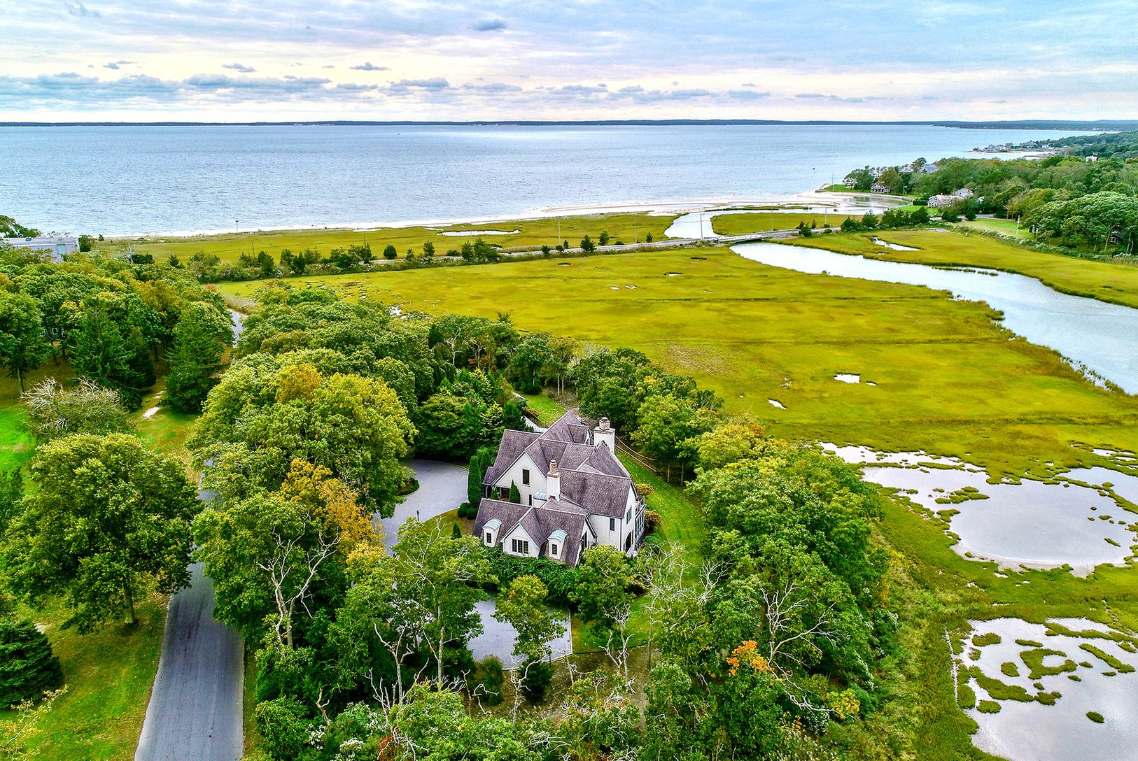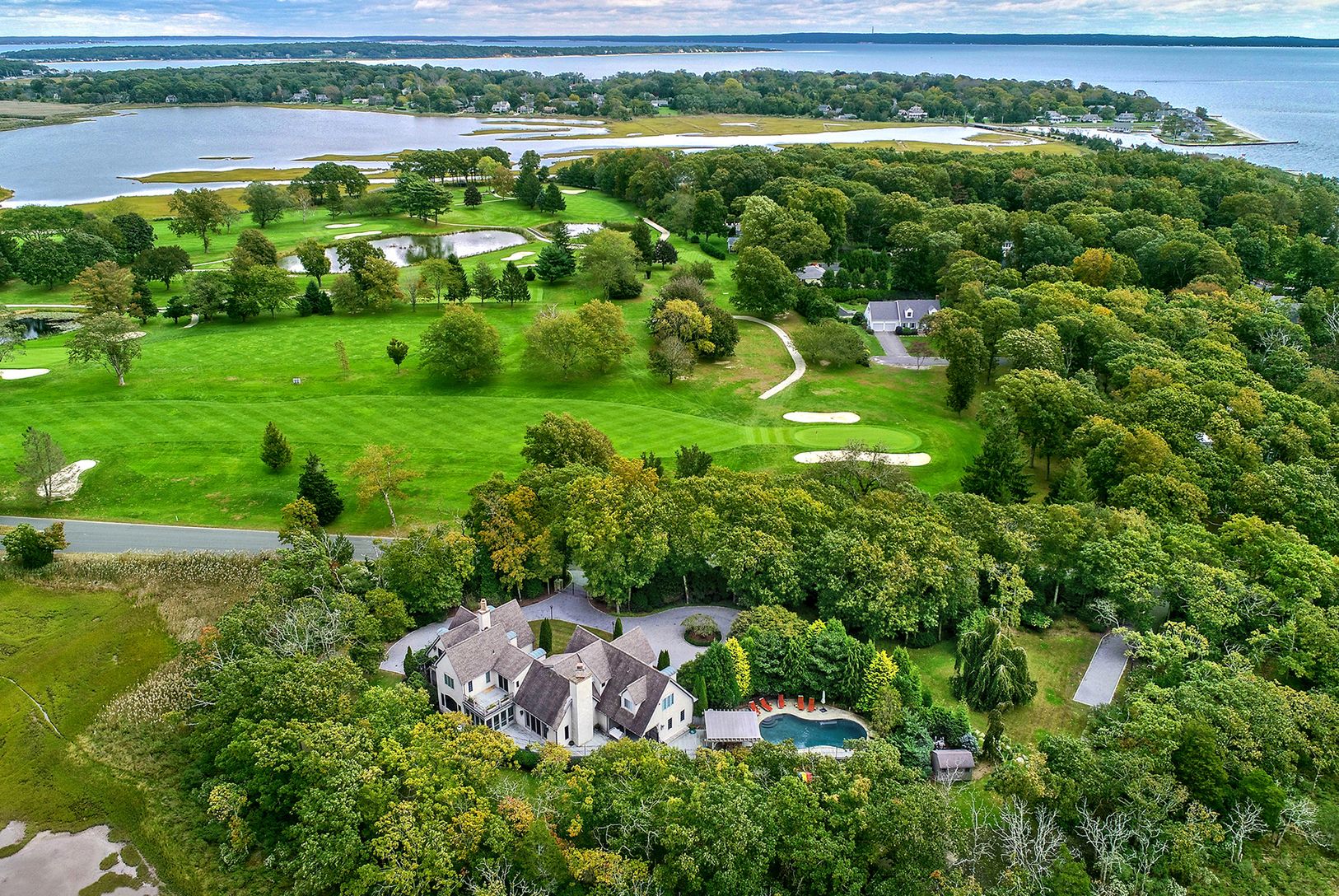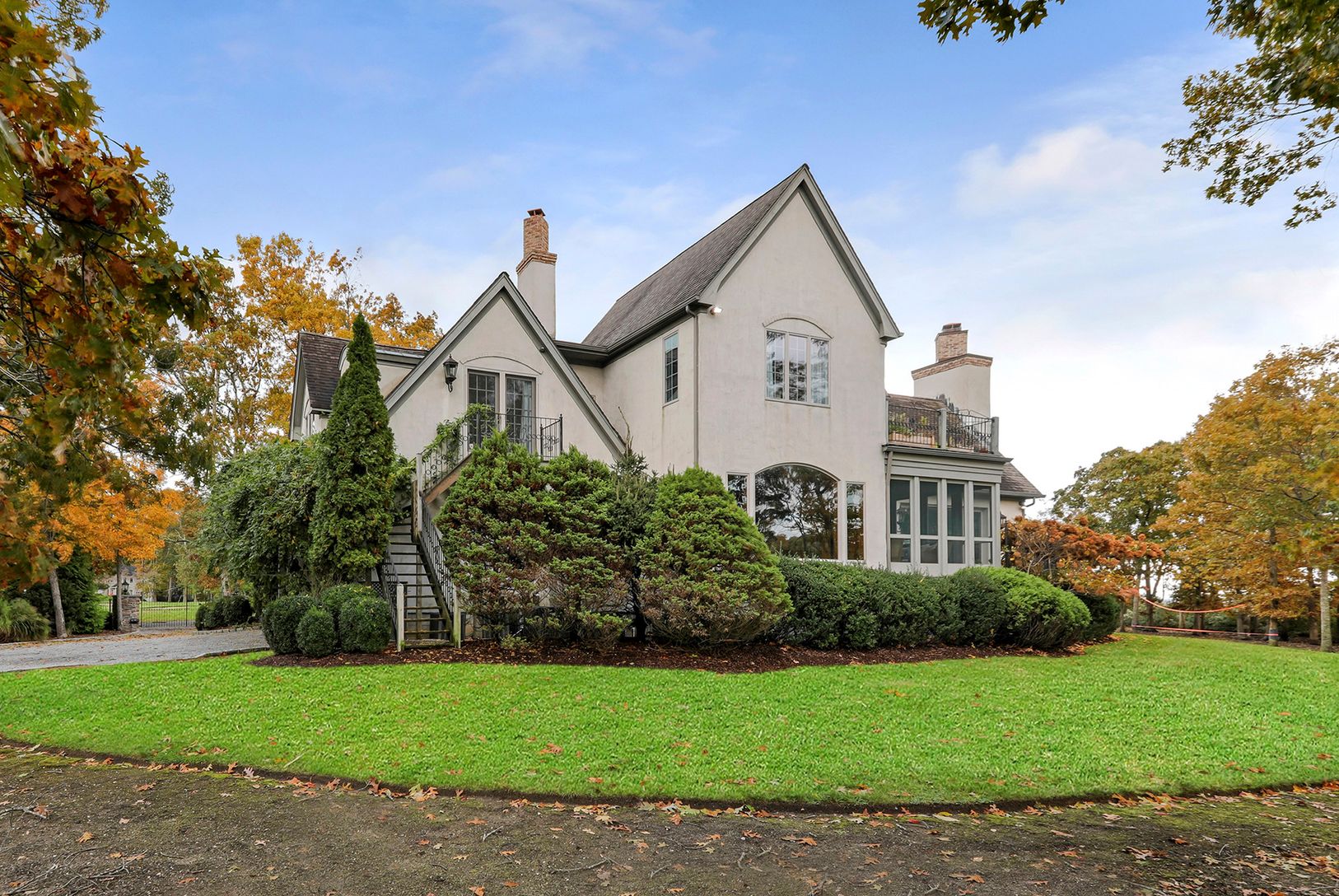Find peace and privacy at this gated waterfront home, custom-built to evoke a European country house. On 6.9 waterfront acres, with heated gunite pool and views of Peconic Bay, Down's Creek and golf course, this is a luxurious North Fork retreat. Upon entry, the arched foyer leads guests to the double height great room, filled with sunlight. Note the brick floors and massive stone fireplace, reminiscent of earlier times. The adjacent dining